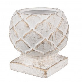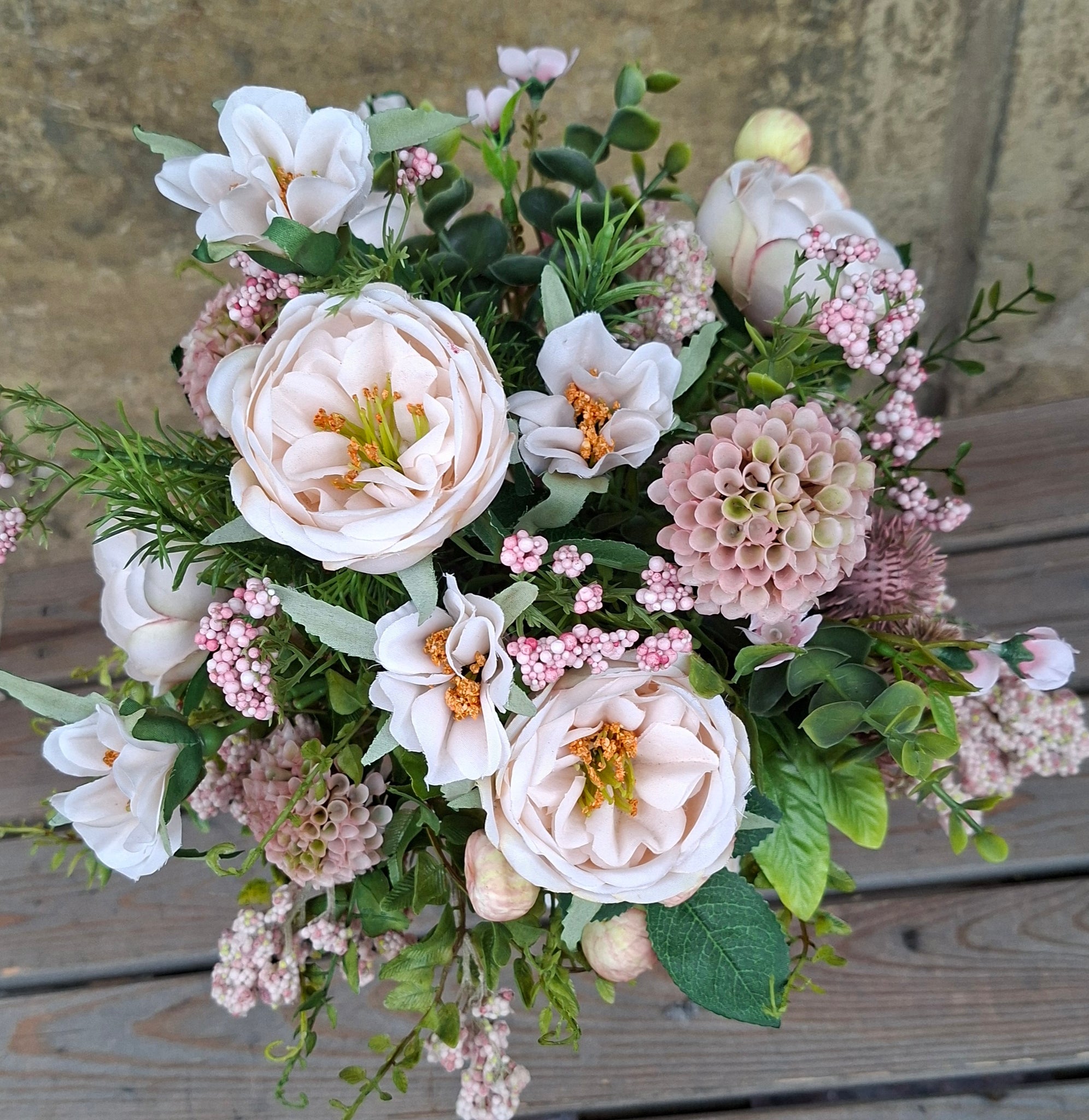 Gesteck in zarten Farben in einem creme-farbenen Vase ist 33 cm hoch, Ø 30 cm