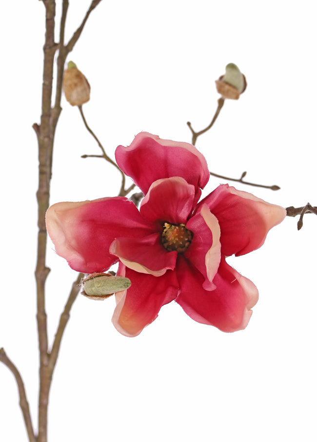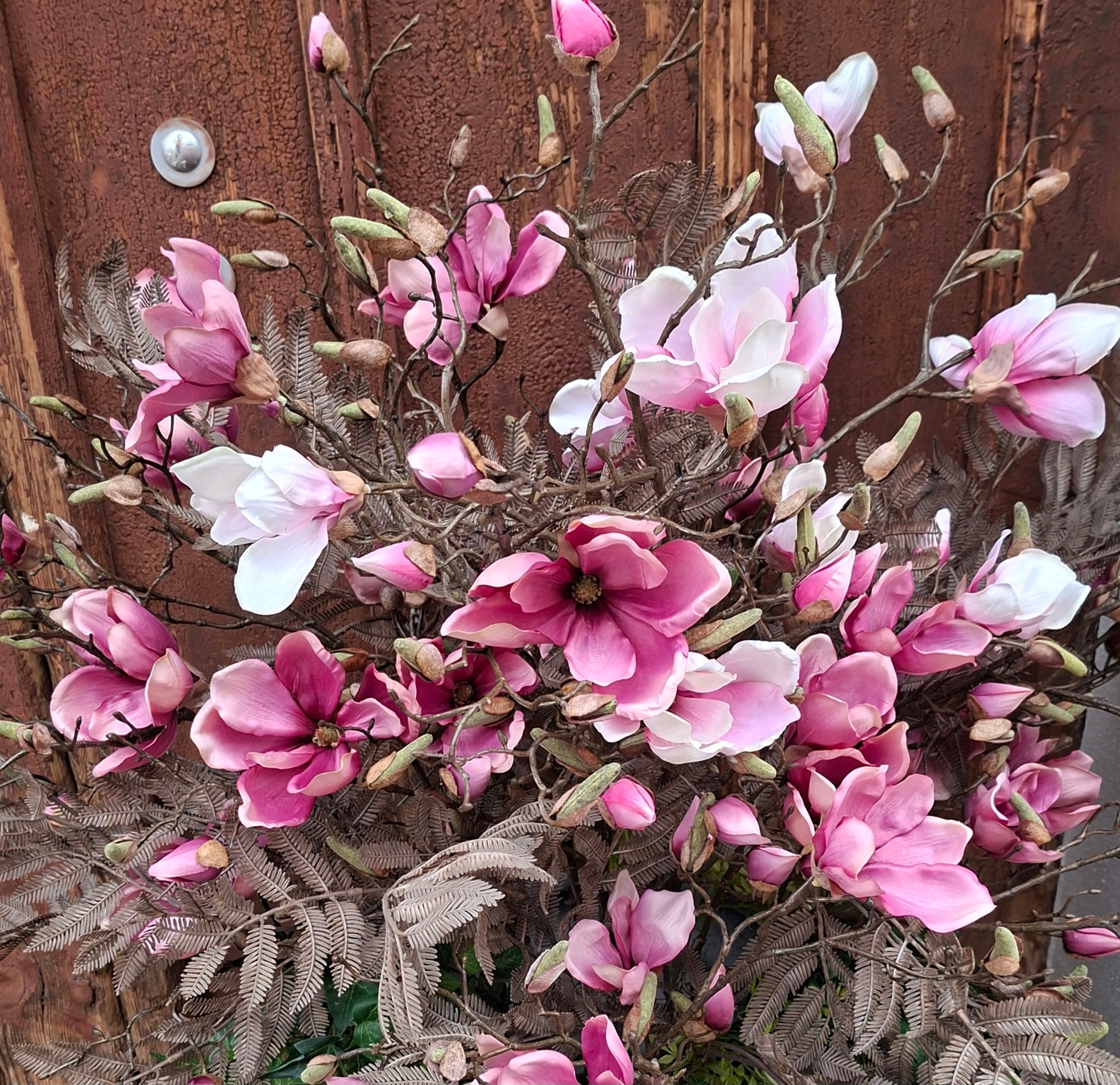 Üppiger Magnolienzweig mit 4 Blüten und vielen Knospen.